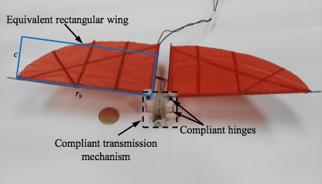 The compliant flapping mechanism helps reducing power consumption and reduces shocks, which allow longer flights and/or higher payloads, lighter structures and better flight stability.