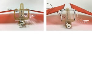 Based on these, we have developed a compliant flapping mechanism based on elastic hinges, and demonstrated that indeed power requirements for flapping are decreased w.r.t. a rigid mechanism, and at the same time shocks are reduced at the benefit of the mechanical structure and flight stability.
